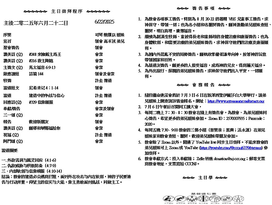 主日崇拜 10:00AM - 11:25 AM  ; 主日学 11:30AM - 12:30PM 青少年 10:00AM - 12:00PM ; 午餐 12:30M - 1:30PM 疫情時期教會的聚會实体和ZOOM网上同步举行, 歡迎新老朋友参加! https://zoom.us/j/2570007935 我 們 的 神 阿 、 求 你 垂 聽 、 因 為 我 們 被 藐 視 . 求 你 使 他 們 的 毀 謗 歸 於 他 們 的 頭 上 、 使 他 們 在 擄 到 之 地 作 為 掠 物 . ( 尼 希 米 記4:4 )