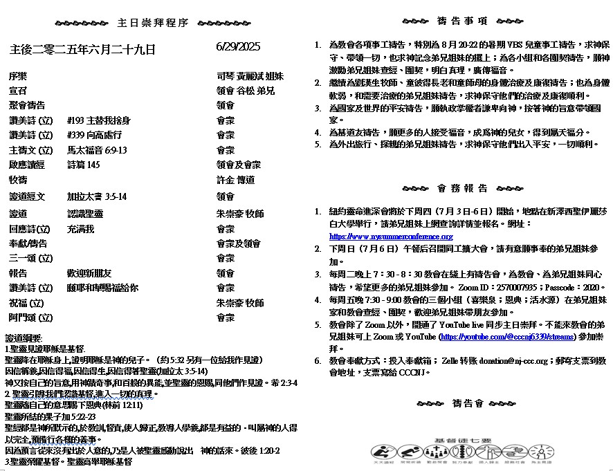 主日崇拜 10:00AM - 11:25 AM  ; 主日学 11:30AM - 12:30PM 青少年 10:00AM - 12:00PM ; 午餐 12:30M - 1:30PM 疫情時期教會的聚會实体和ZOOM网上同步举行, 歡迎新老朋友参加! https://zoom.us/j/2570007935 只等真理的聖靈來了,他要引導你們明白一切的真理.因為他不是憑自己說的,乃是把他所聽見的都說出來,並要把將來的事告訴你們。他要榮耀我.因為他要將受於我的,告訴你們。 ( 約 翰 福 音16:13-14 )