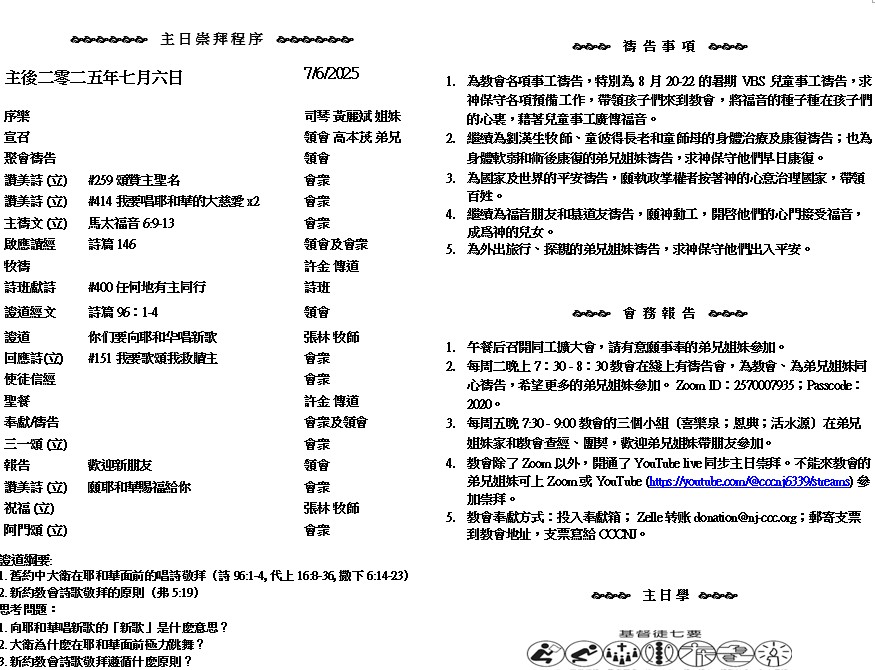 主日崇拜 10:00AM - 11:25 AM  ; 主日学 11:30AM - 12:30PM 青少年 10:00AM - 12:00PM ; 午餐 12:30M - 1:30PM 疫情時期教會的聚會实体和ZOOM网上同步举行, 歡迎新老朋友参加! https://zoom.us/j/2570007935 你们要向耶和华唱新歌,全地都要向耶和华歌唱。要向耶和华歌唱,称颂他的名,天天传扬他的救恩。在列邦中述说他的荣耀,在万民中述说他的奇事。因耶和华为大,当受极大的赞美,他在万神之上,当受敬畏。 ( 詩篇 96:1-4 )