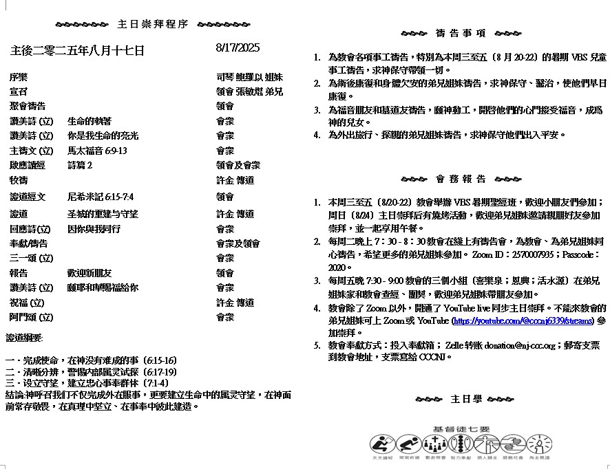 主日崇拜 10:00AM - 11:25 AM  ; 主日学 11:30AM - 12:30PM 青少年 10:00AM - 12:00PM ; 午餐 12:30M - 1:30PM 疫情時期教會的聚會实体和ZOOM网上同步举行, 歡迎新老朋友参加! https://zoom.us/j/2570007935 若 不 是 耶 和 華 建 造 房 屋 、 建 造 的 人 就 枉 然 勞 力 . 若 不 是 耶 和 華 看 守 城 池 、 看 守 的 人 就 枉 然 儆 醒 。 ( 詩篇 127:1 )
