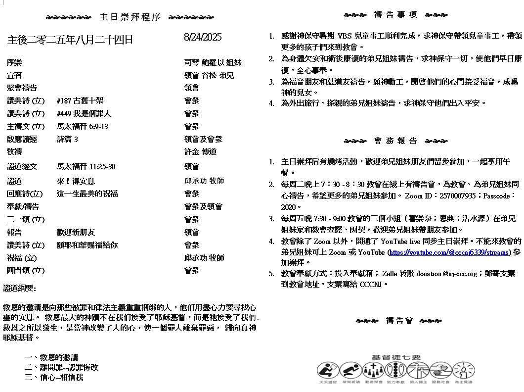 主日崇拜 10:00AM - 11:25 AM  ; 主日学 11:30AM - 12:30PM 青少年 10:00AM - 12:00PM ; 午餐 12:30M - 1:30PM 疫情時期教會的聚會实体和ZOOM网上同步举行, 歡迎新老朋友参加! https://zoom.us/j/2570007935 凡 勞 苦 擔 重 擔 的 人 、 可 以 到 我 這 裡 來 、 我 就 使 你 們 得 安 息 。我 心 裡 柔 和 謙 卑 、 你 們 當 負 我 的 軛 、 學 我 的 樣 式 、 這 樣 、 你 們 心 裡 就 必 得 享 安 息 。因 為 我 的 軛 是 容 易 的 、 我 的 擔 子 是 輕 省 的 。 ( 馬 太 福 音11:28-30 )