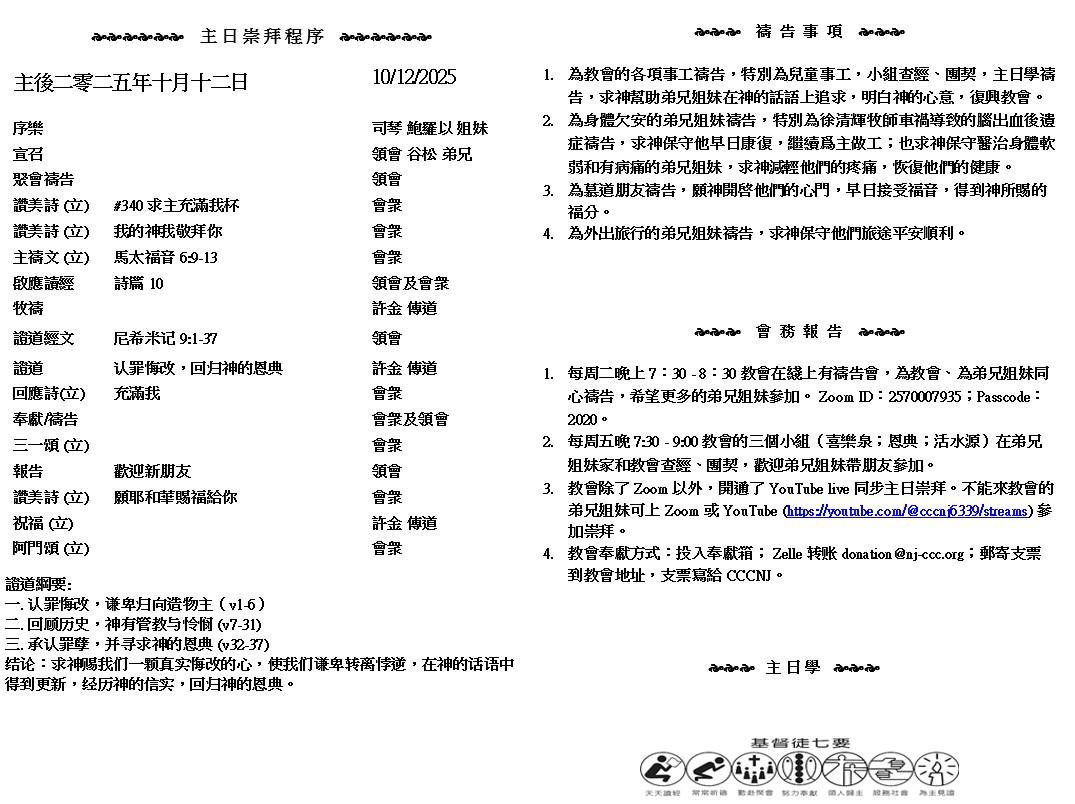 主日崇拜 10:00AM - 11:25 AM  ; 主日学 11:30AM - 12:30PM 青少年 10:00AM - 12:00PM ; 午餐 12:30M - 1:30PM 疫情時期教會的聚會实体和ZOOM网上同步举行, 歡迎新老朋友参加! https://zoom.us/j/2570007935 你 是 樂 意 饒 恕 人 、 有 恩 典 、 有 憐 憫 、 不 輕 易 發 怒 、 有 豐 盛 慈 愛 的 神 、 並 不 丟 棄 他 們 。 ( 尼 希 米 記9:17b )