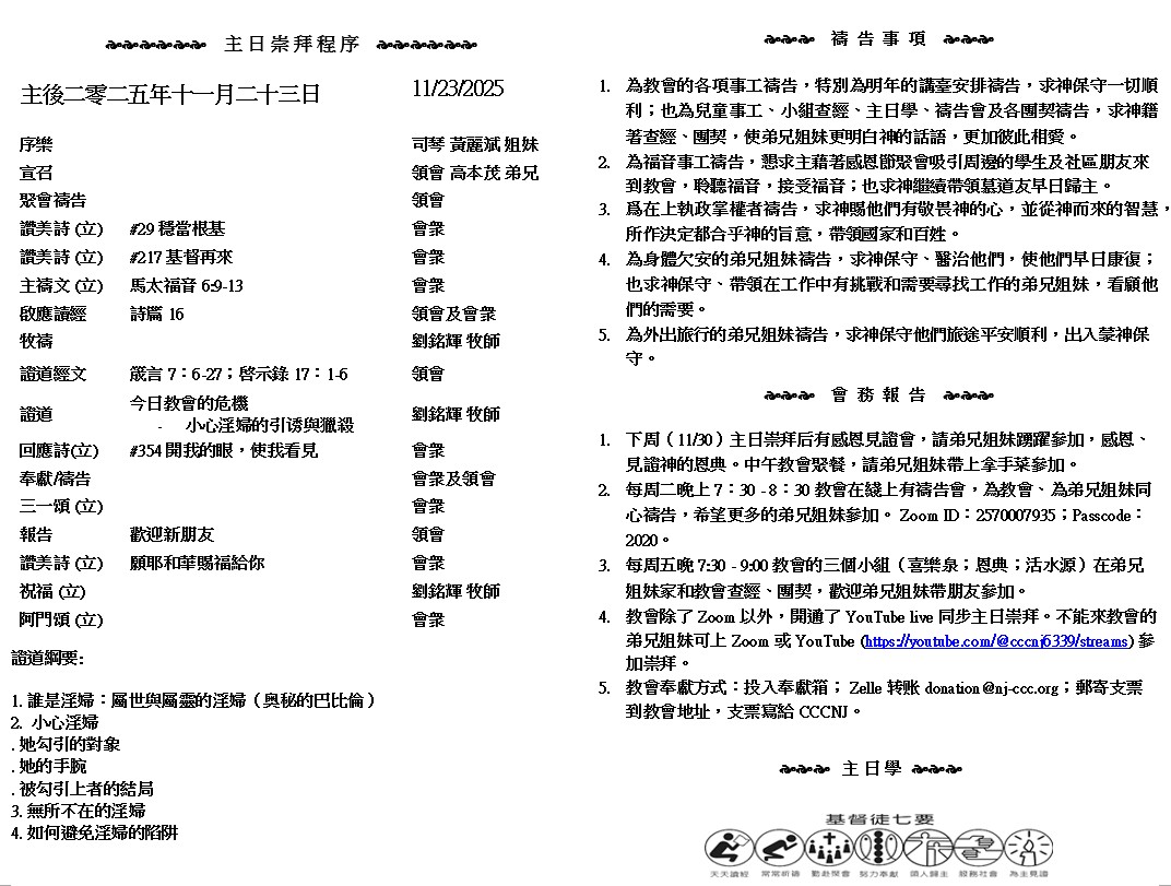 主日崇拜 10:00AM - 11:25 AM  ; 主日学 11:30AM - 12:30PM 青少年 10:00AM - 12:00PM ; 午餐 12:30M - 1:30PM 疫情時期教會的聚會实体和ZOOM网上同步举行, 歡迎新老朋友参加! https://zoom.us/j/2570007935 務要謹守、儆醒.因為你們的仇敵魔鬼、如同吼叫的獅子、遍地游行、尋找可吞喫的人. ( 彼得前書 5:8 )