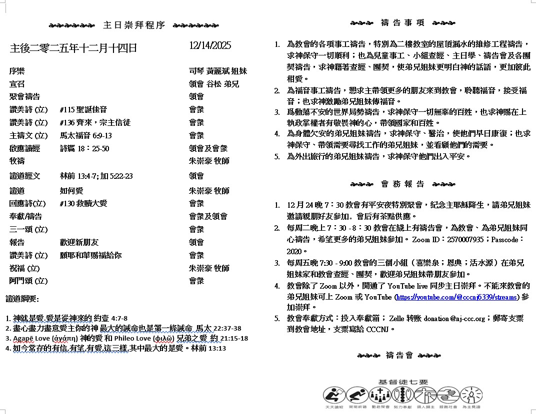主日崇拜 10:00AM - 11:25 AM  ; 主日学 11:30AM - 12:30PM 青少年 10:00AM - 12:00PM ; 午餐 12:30M - 1:30PM 疫情時期教會的聚會实体和ZOOM网上同步举行, 歡迎新老朋友参加! https://zoom.us/j/2570007935 愛是恆久忍耐,又有恩慈.愛是不嫉妒.愛是不自誇.不張狂.不作害羞的事.不求自己的益處.不輕易發怒.不計算人的惡.不喜歡不義.只喜歡真理.愛是永不止息.. ( 哥林多前書13:4-7 )