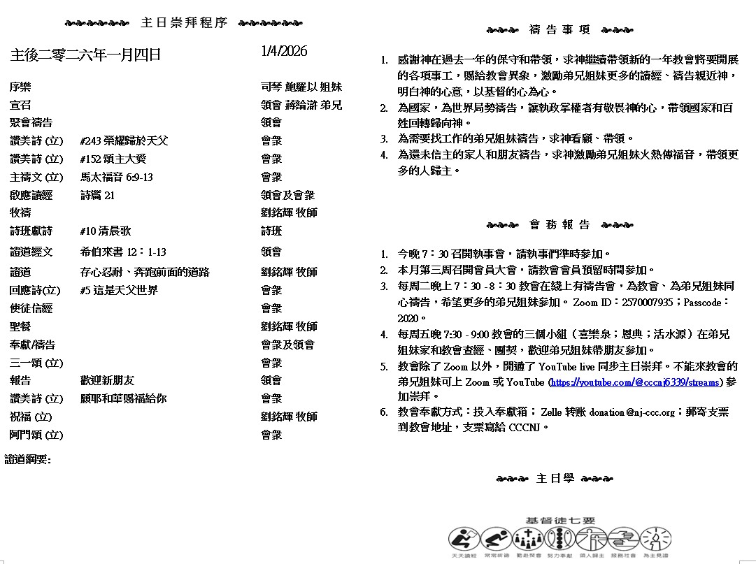 主日崇拜 10:00AM - 11:25 AM  ; 主日学 11:30AM - 12:30PM 青少年 10:00AM - 12:00PM ; 午餐 12:30M - 1:30PM 疫情時期教會的聚會实体和ZOOM网上同步举行, 歡迎新老朋友参加! https://zoom.us/j/2570007935 我們既有這許多的見證人、如同雲彩圍著我們、就當放下各樣的重擔、脫去容易纏累我們的罪、存心忍耐、奔那擺在我們前頭的路程、仰望為我們信心創始成終的耶穌. ( 希伯來書 12:1-2a )